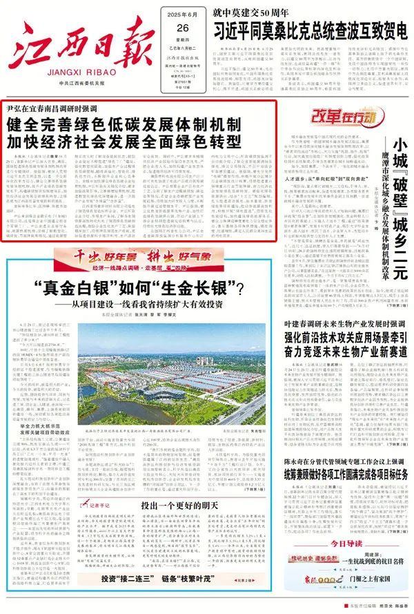 Da Jiang Network/Da Jiang News App News: Jiangxi Daily Full Media Reporter Wei Xing reports: On June 25, Provincial Party Secretary Yin Hong conducted a special research visit to Yichun and Nanchang to explore reforms in the institutional mechanisms for promoting green and low-carbon development. He emphasized the need to thoroughly implement Xi Jinping's thoughts on ecological civilization, using further comprehensive reforms as a driving force to improve the institutional mechanisms for green and low-carbon development, enhance the green and low-carbon development level of industries, establish a carbon emissions dual-control system, accelerate the comprehensive green transformation of socio-economic development, and make green the distinctive hallmark of Jiangxi's high-quality development.